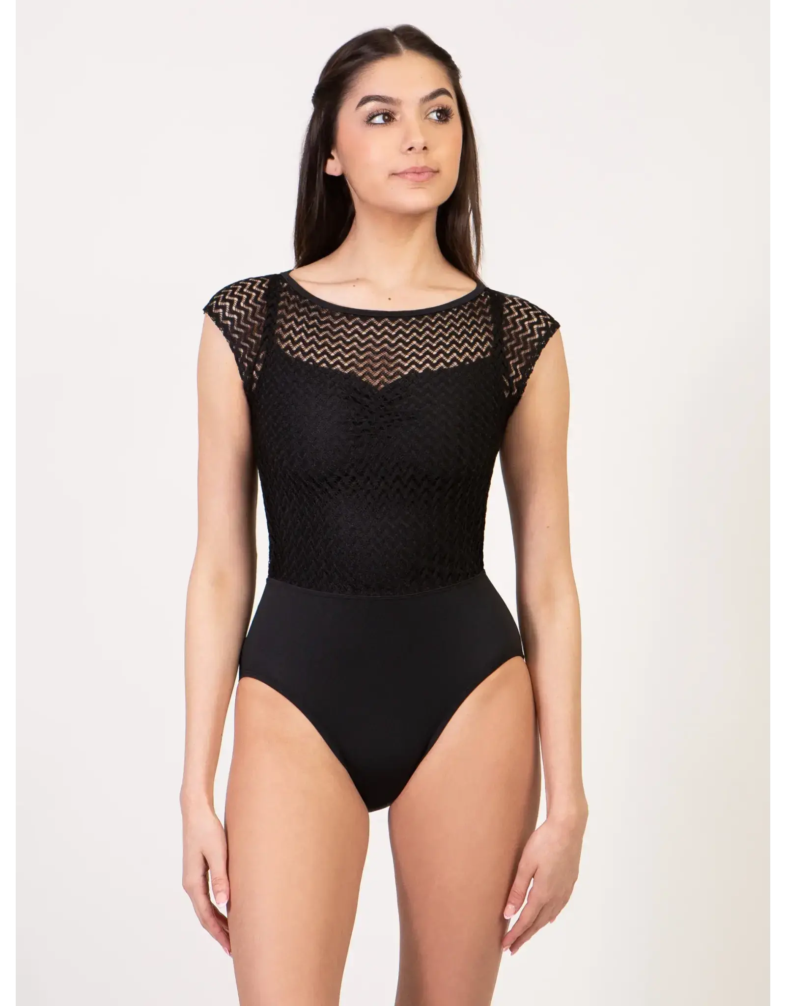 Pinch front camisole leotard with cap sleeve overlay and draped back. The Woodstock Collection features modern, tailored leotards made to look vintage with a crochet-inspired pointelle stretch knit. Available in deep garnet with multi-colored stripes to really make a statement, or choose to stay classic with solid slate blue or black.